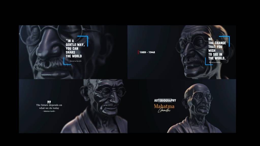 ProductionSarvamaya StudioYear2026DescriptionA cinematic 3D visual featuring Mahatma Gandhi, combined with timeless motivational quotes about personal responsibility and social change. This project emphasizes emotional depth, minimalistic aesthetics, and philosophical storytelling through lighting, composition, and typography. Designed to inspire reflection and awareness—because real change starts from within.